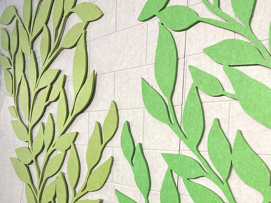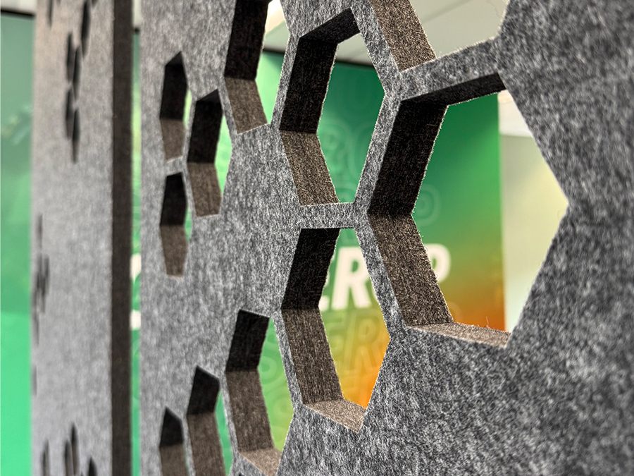 De mogelijkheden van PET-vilt zijn eindeloos! Deze panelen zijn gemaakt van recyclede PET-flessen en zorgen voor een hoge akoestische demping. Dankzij de beschikbaarheid van meer dan 30 kleuren, kunnen we hier de mooiste decoraties van maken. De gekleurde panelen kunnen in vormen worden uitgesneden en zelfs voorzien worden van een full colour print. Zo is er altijd een variant die past bij jouw bedrijfsruimte en interieur. Wij maken graag een uniek ontwerp.
