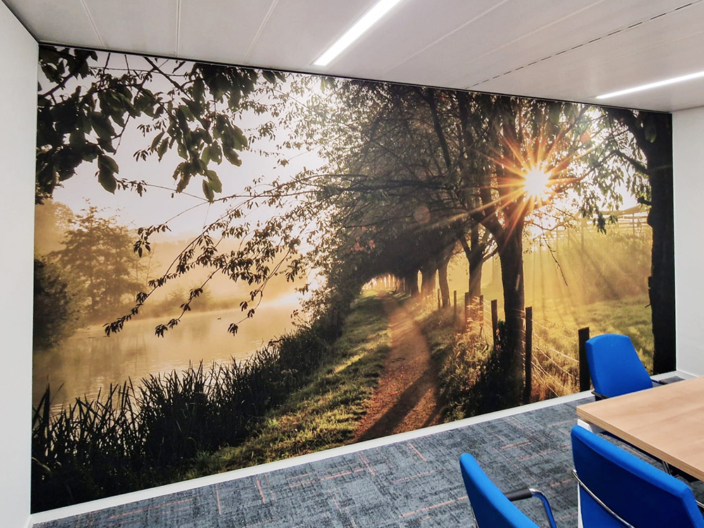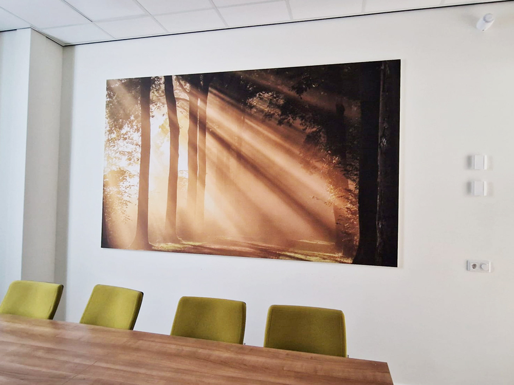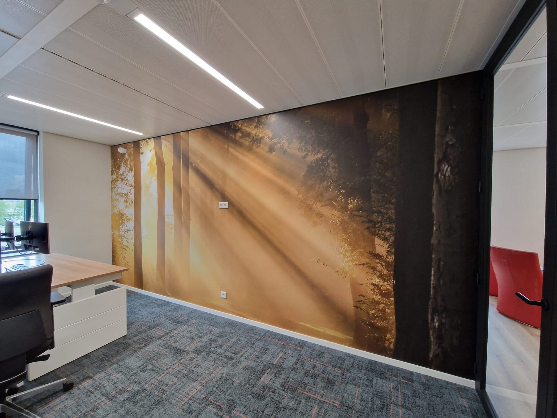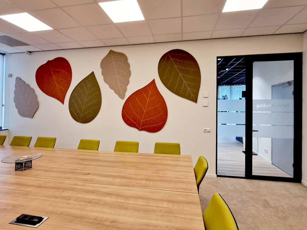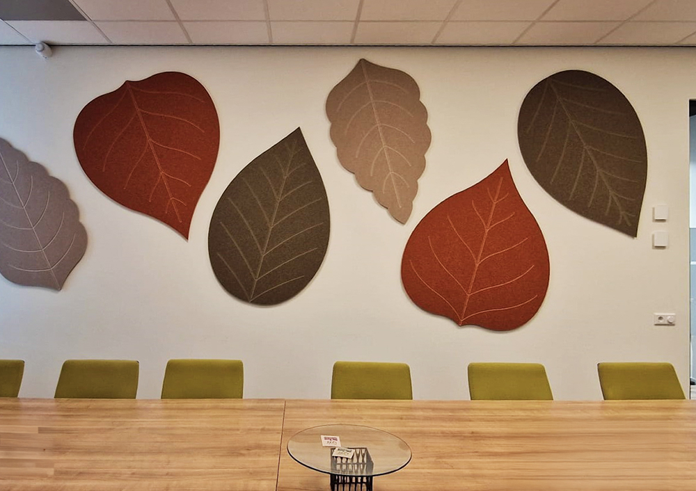 De muren zijn aangekleed met kleurrijke Airtex-prints en akoestische peesdoeken, waardoor de ruimtes niet alleen prachtig ogen, maar ook veel prettiger klinken. In de grote spreekkamer zorgen vilten herfstbladeren, helemaal op maat gemaakt en met precisie gefreesd in onze eigen werkplaats, voor een unieke mix van akoestiek en design.
