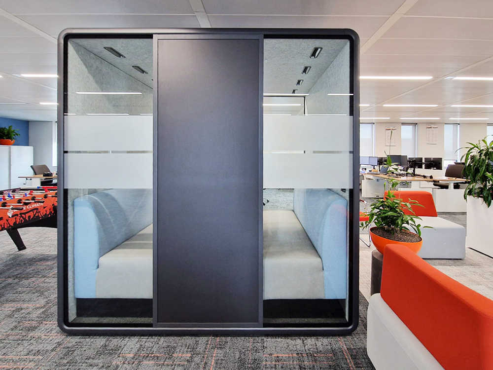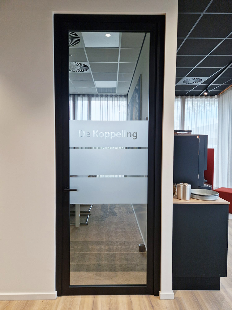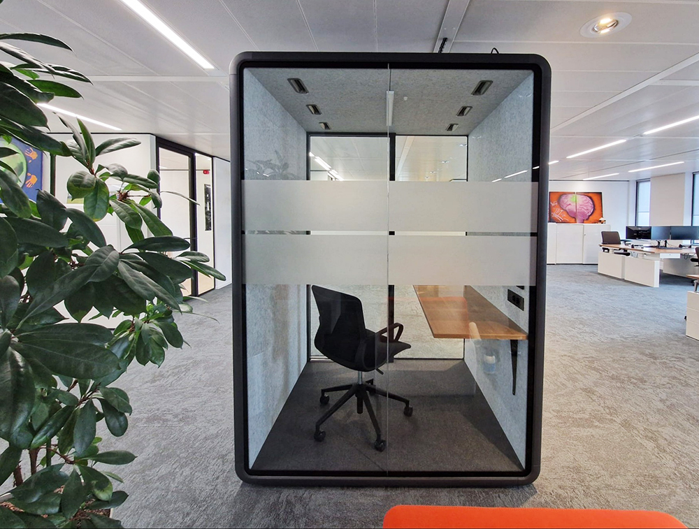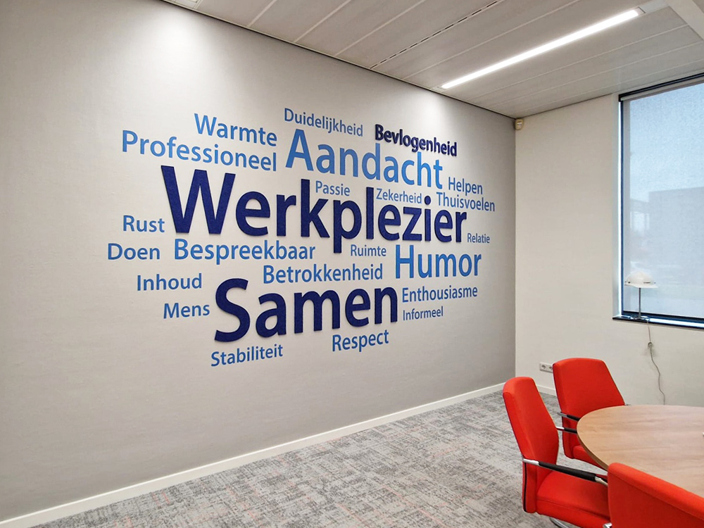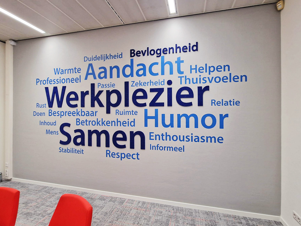 Een echte blikvanger is de Wordcloud-wand. Dankzij losse PET-viltletters springt de tekst bijna letterlijk van de muur af en ontstaat een speels 3D-effect. Ook aan privacy is gedacht: zes belcellen zijn voorzien van banen crystalglasfolie, zodat collega’s ongestoord kunnen bellen zonder dat de open sfeer verloren gaat.
