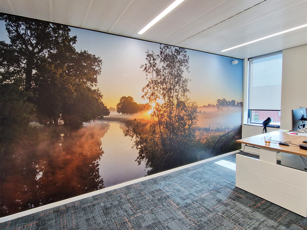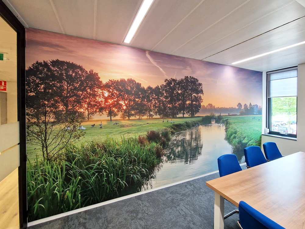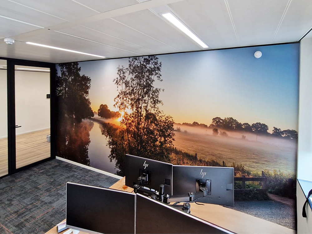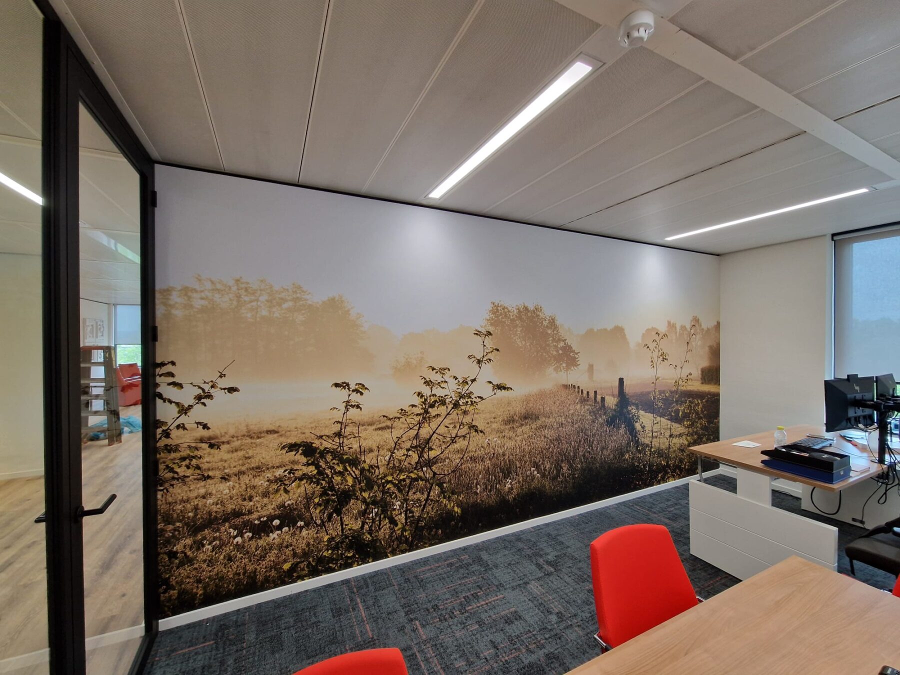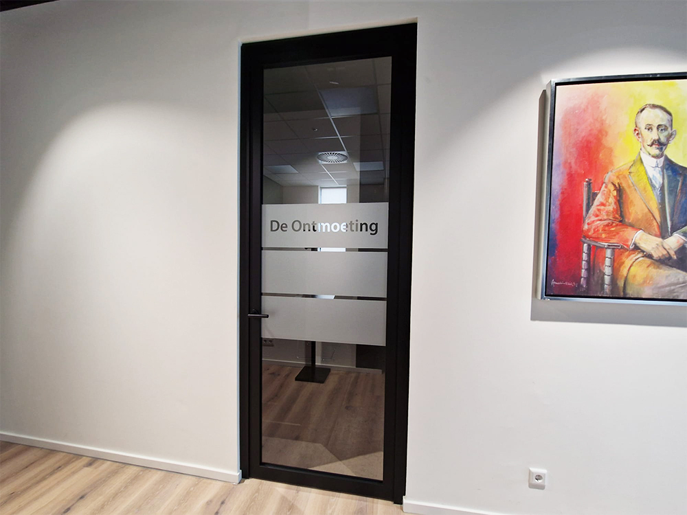 Een echte blikvanger is de Wordcloud-wand. Dankzij losse PET-viltletters springt de tekst bijna letterlijk van de muur af en ontstaat een speels 3D-effect. Ook aan privacy is gedacht: zes belcellen zijn voorzien van banen crystalglasfolie, zodat collega’s ongestoord kunnen bellen zonder dat de open sfeer verloren gaat.