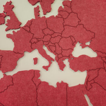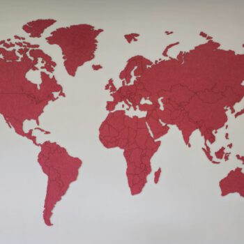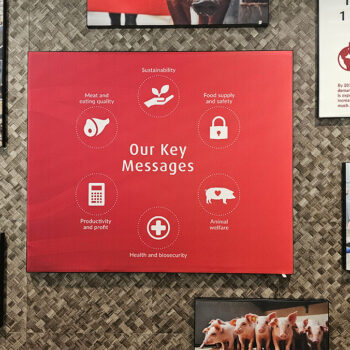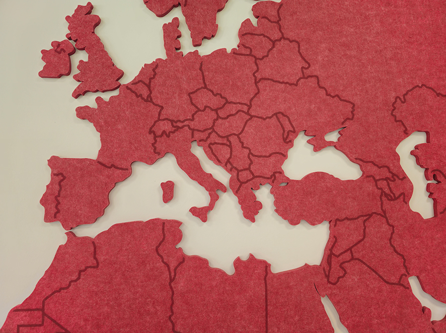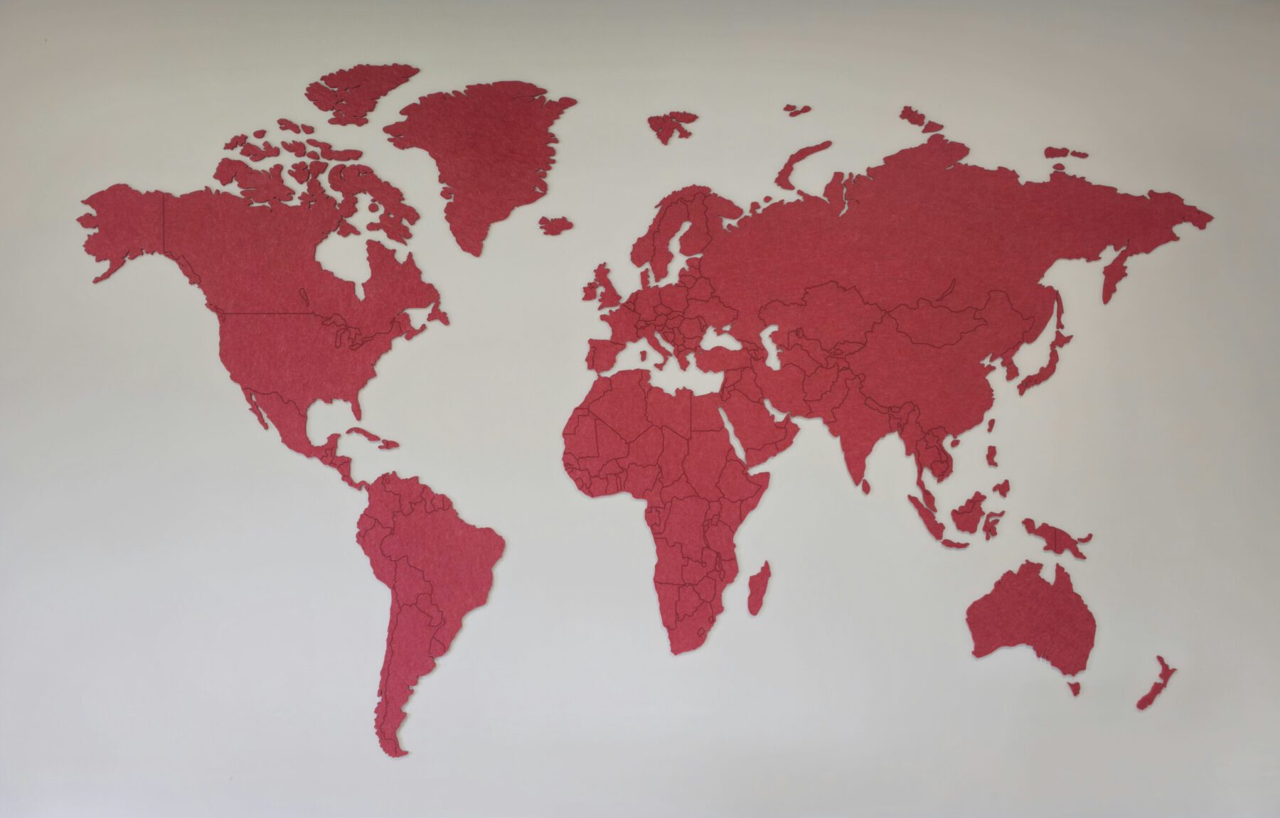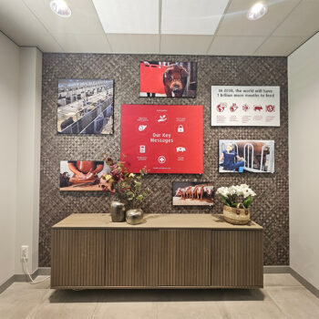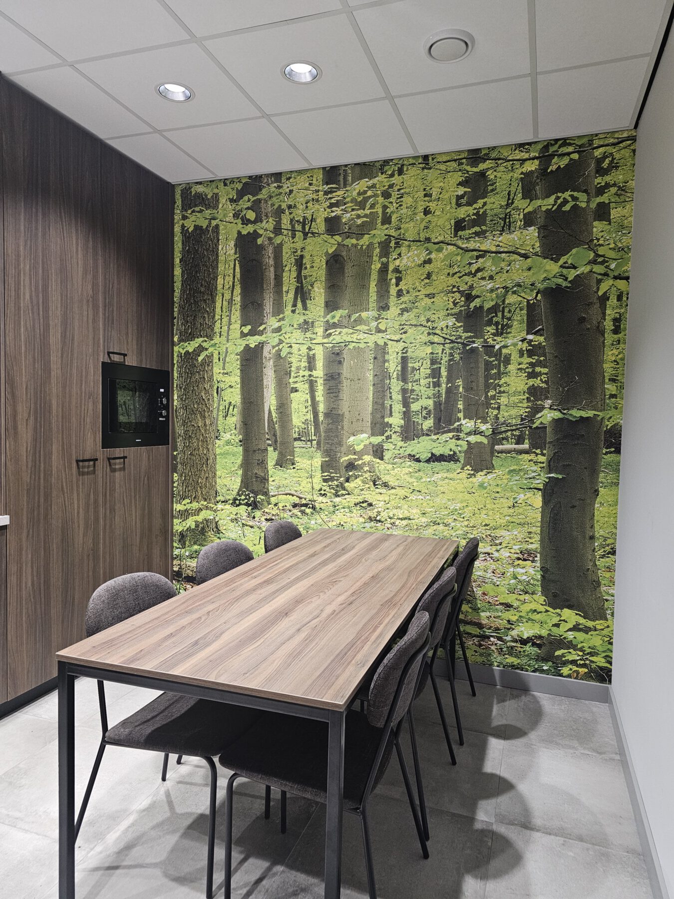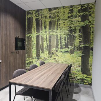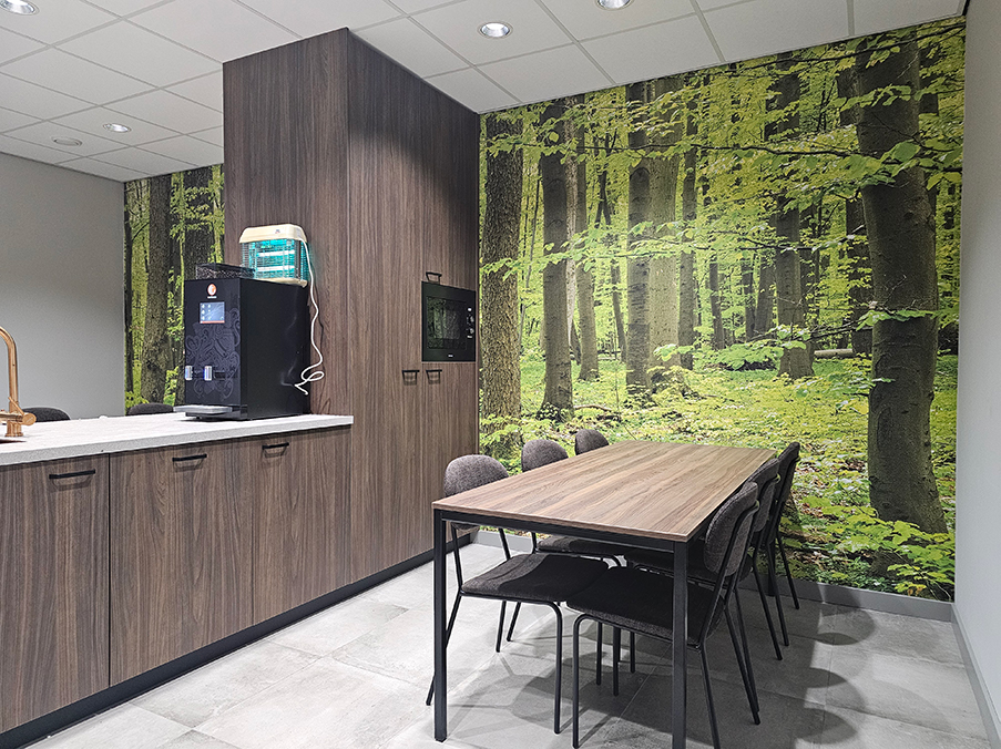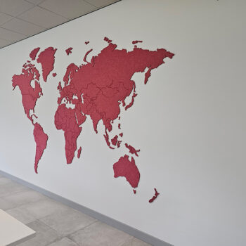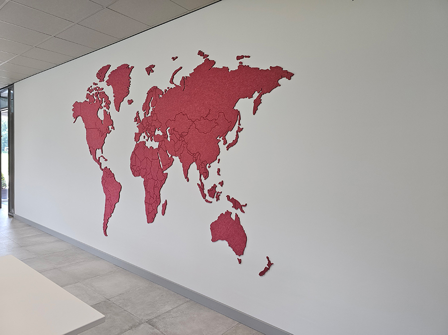 De wanden in de kantine zijn voorzien van naadloos fotobehang dat doorloopt voorbij het keukenblok. In het kantoor, waar het kenmerkende rode varken zelfs bovenop de kast te vinden is, is de wereldkaart van geprint PET vilt een echte eyecatcher!