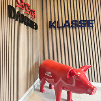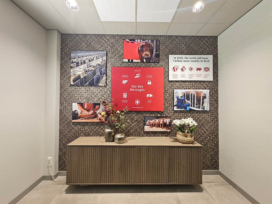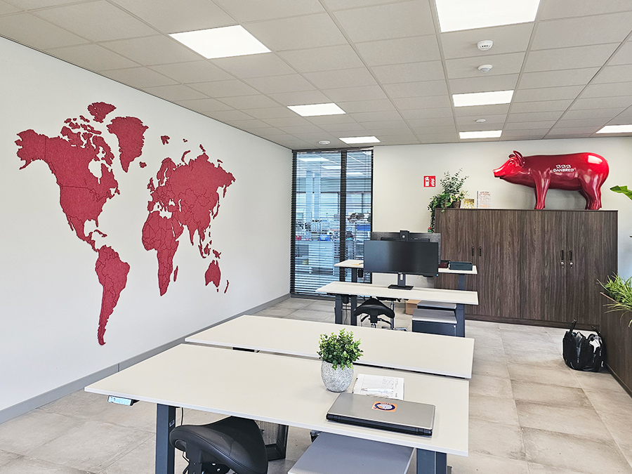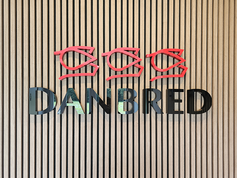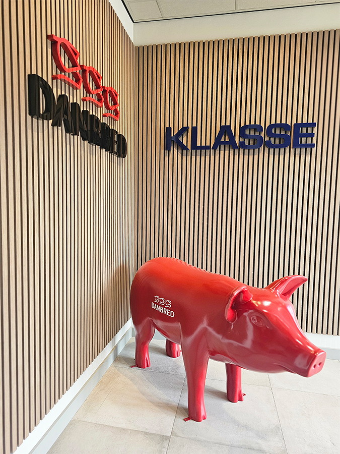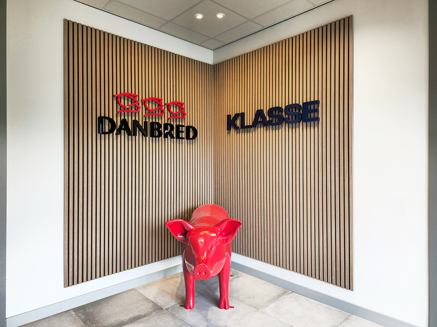 Bij binnenkomst in de hal valt je oog direct op de houten lattenwand waar de logo’s van DanBred en KLASSE, gelaserd uit dik acrylaat, op gemonteerd zijn. Samen met het rode varken, het beeldmerk van DanBred en door ons voorzien van het bedrijfslogo, is deze ontvangstruimte meteen het visitekaartje van het bedrijf.