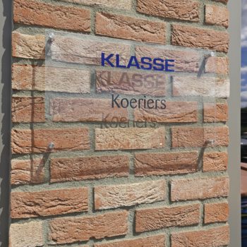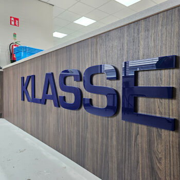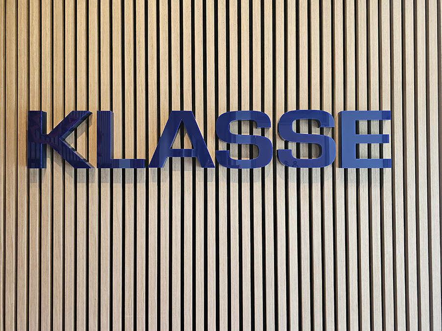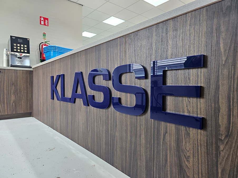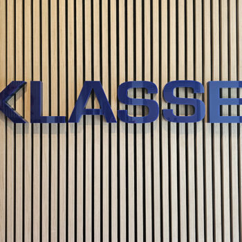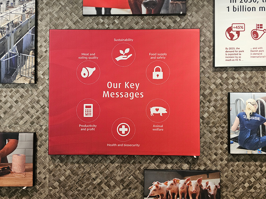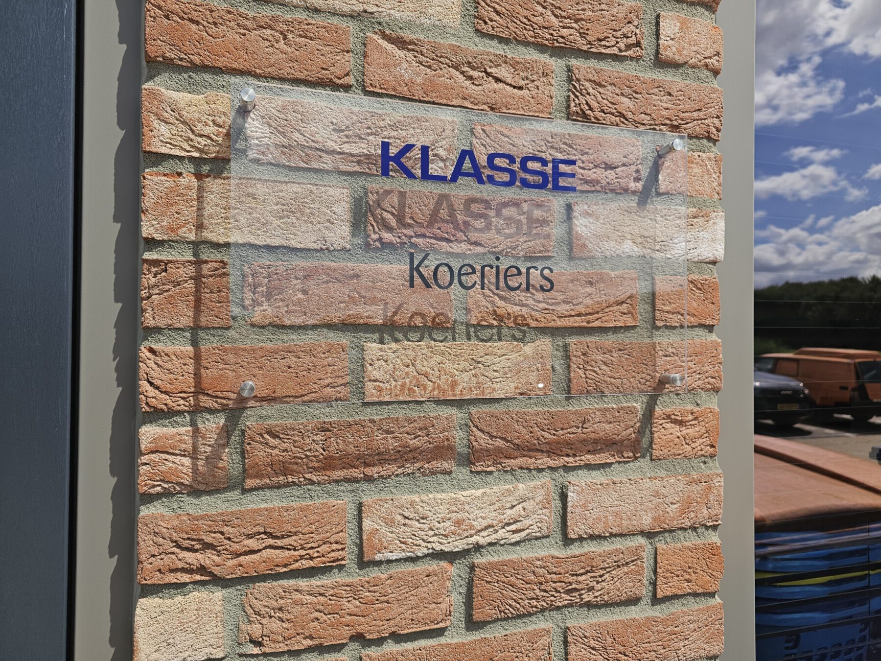 Bij binnenkomst in de hal valt je oog direct op de houten lattenwand waar de logo’s van DanBred en KLASSE, gelaserd uit dik acrylaat, op gemonteerd zijn. Samen met het rode varken, het beeldmerk van DanBred en door ons voorzien van het bedrijfslogo, is deze ontvangstruimte meteen het visitekaartje van het bedrijf.