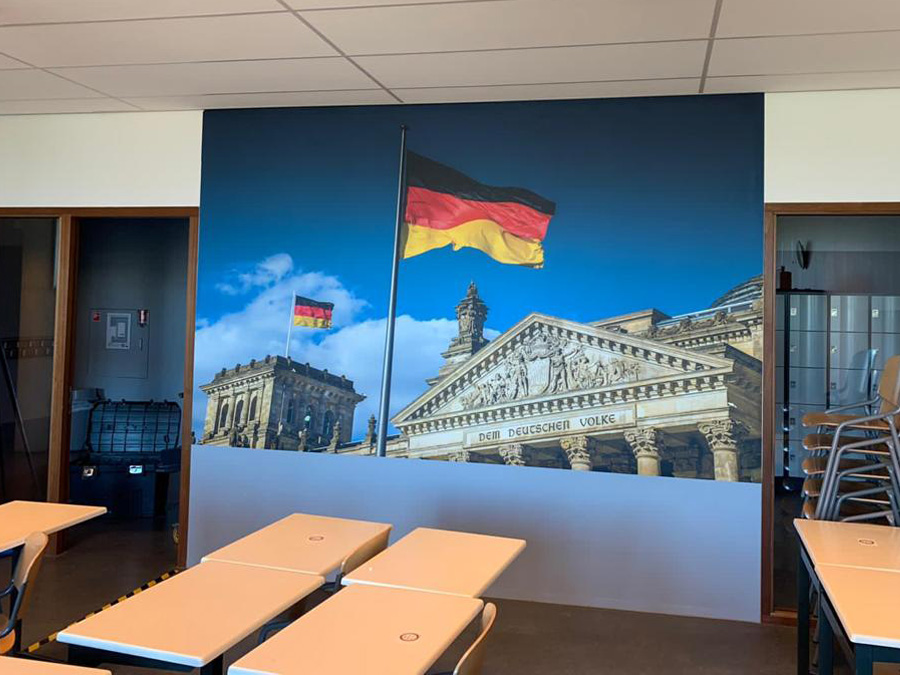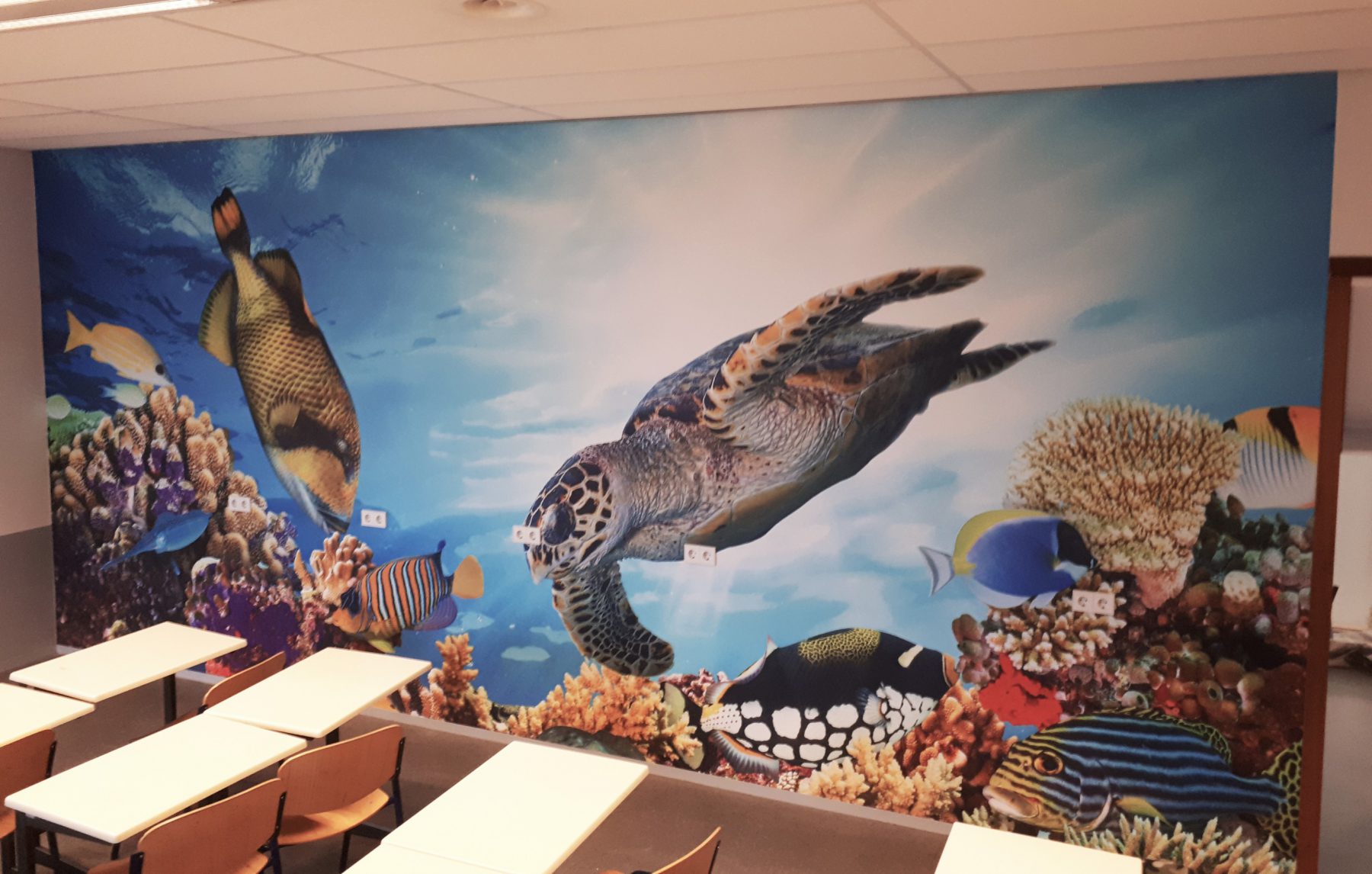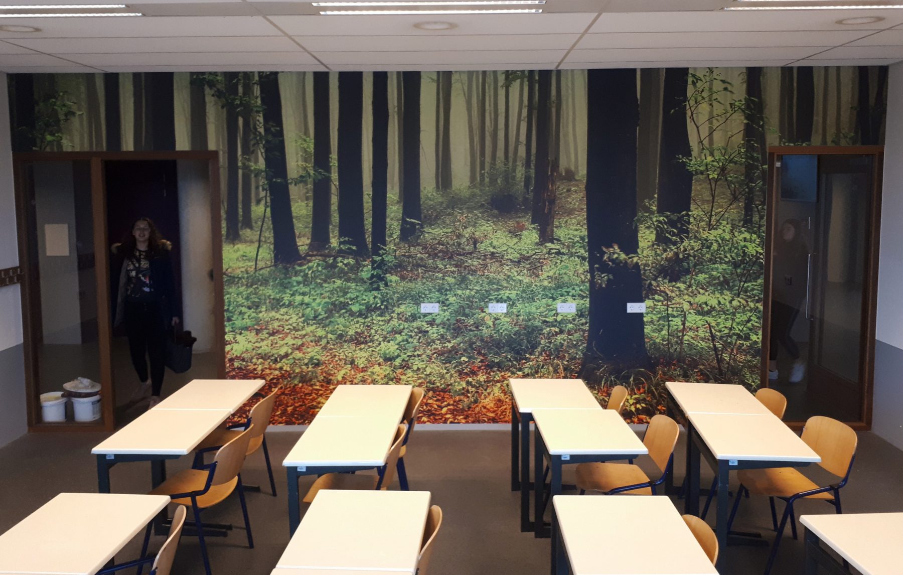De wandbekleding in de klaslokalen zorgt ervoor dat de scholieren in een inspirerende omgeving les kunnen krijgen en dat het direct duidelijk wordt in welk lokaal zij zich bevinden. Wat is er nu leuker dan leren in een bos, onderwaterwereld of wereldstad?!