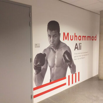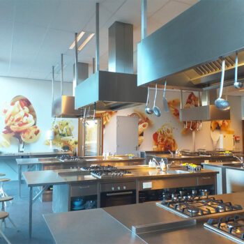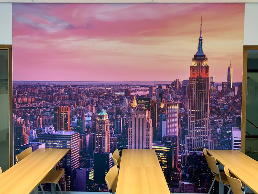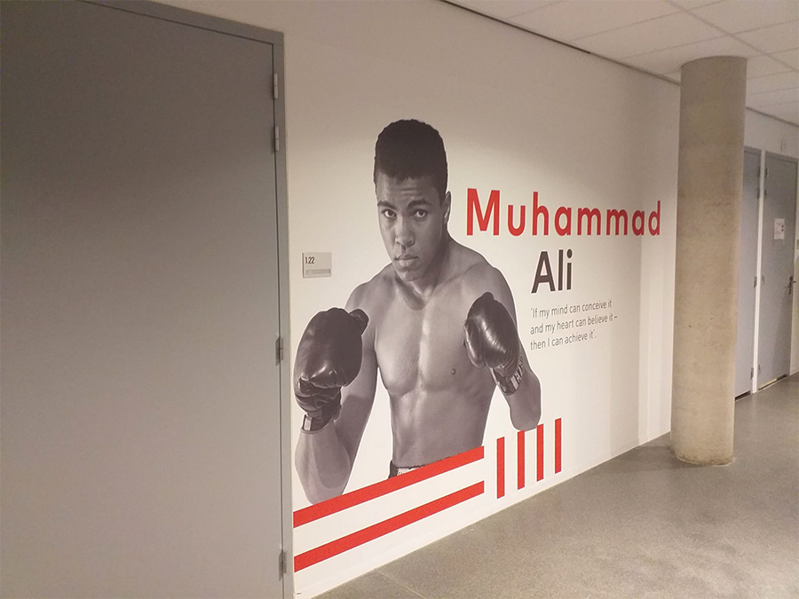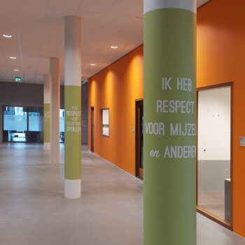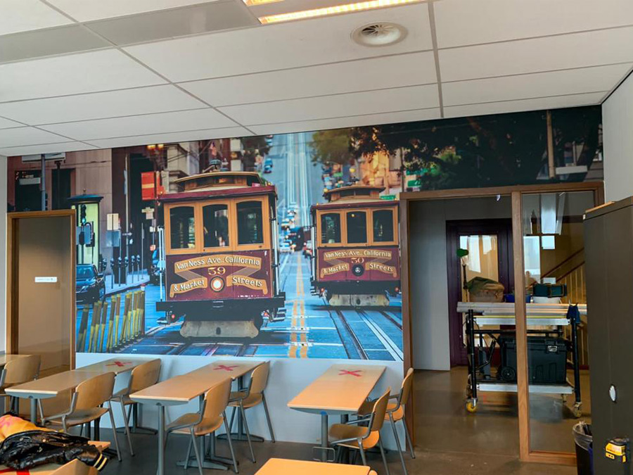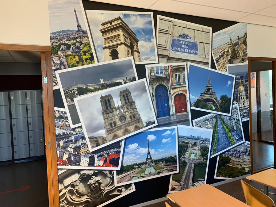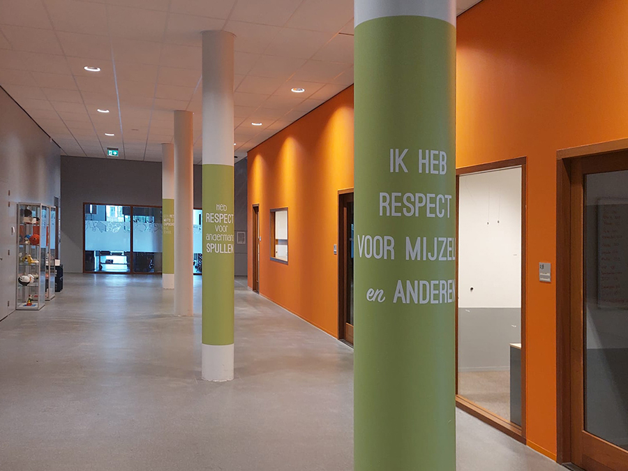 De wandbekleding in de klaslokalen zorgt ervoor dat de scholieren in een inspirerende omgeving les kunnen krijgen en dat het direct duidelijk wordt in welk lokaal zij zich bevinden. Wat is er nu leuker dan leren in een bos, onderwaterwereld of wereldstad?!